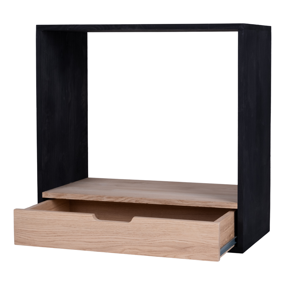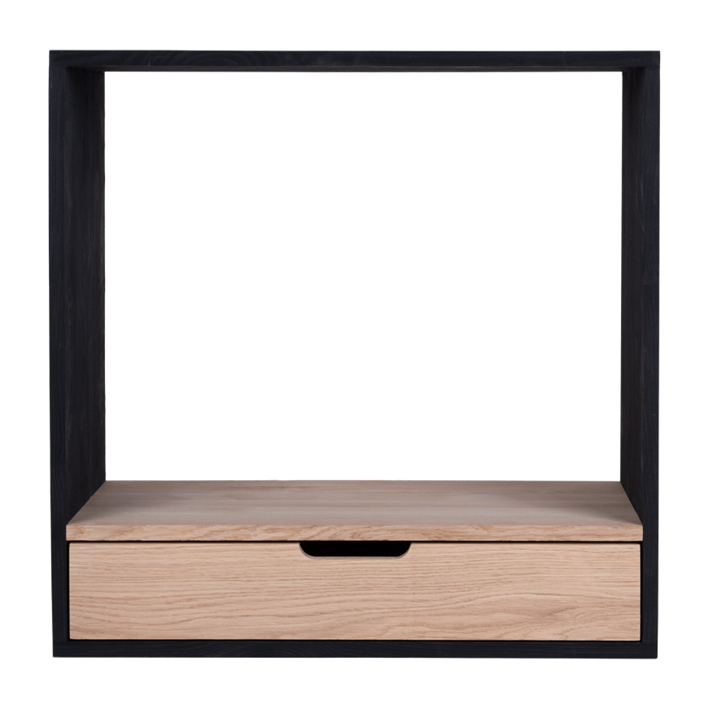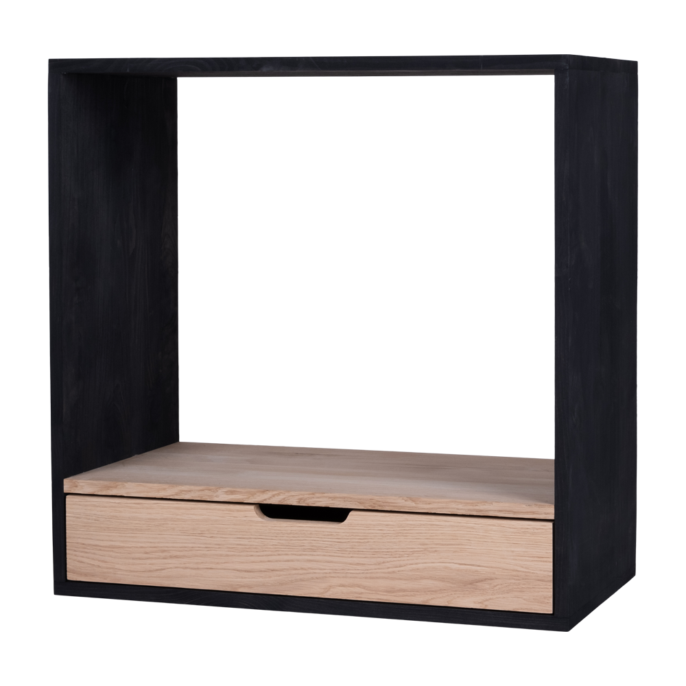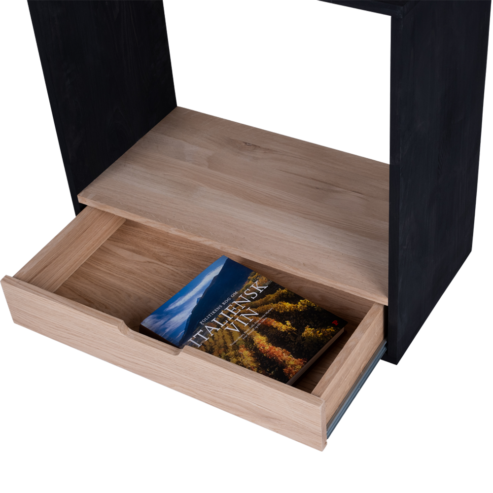 Materialet er sortbejdset fyrretræ med egetræ skuffe.