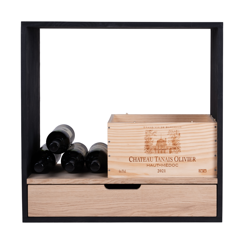 Reolmodulet her består af en ramme med en skuffe i bunden til al din vintilbehør. Forskellige typer af indmad passer perfekt ind i denne ramme. Du kan købe skabslåge, en hylde eller en holder til dine glas og på den måde indrette din vinreol lige som det passer dig. Inden i rammen er der forborede huller, så du nemt kan montere de forskellige typer indmad.