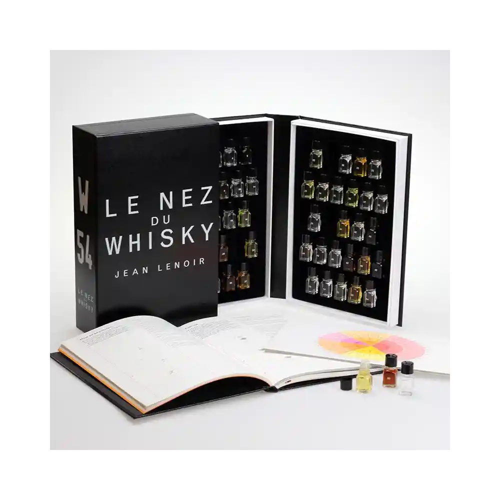 "Whisky duftsæt" Duftsættet med 54 dufte fra Jean Lenoir. Duftsættet indeholder 54 af de mest almindeligt forekomne dufte, der kan genkendes i whisky. Medfølgende Guidebog forklarer hvordan vi reagere på dufte, og hvordan vi kan udnytte denne viden, når vi skal smage på whisky. Et ”must” for alle whiskyelsker og entusiaster.